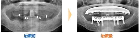 20年前に当院にてブリッジ治療を受けられたのですが、今回1番奥の歯が過度のストレスにより疼痛が生じ、ストレス軽減の目的で、ブリッジを切断し、インプラント治療を受けられました。(インプラント4本埋入)